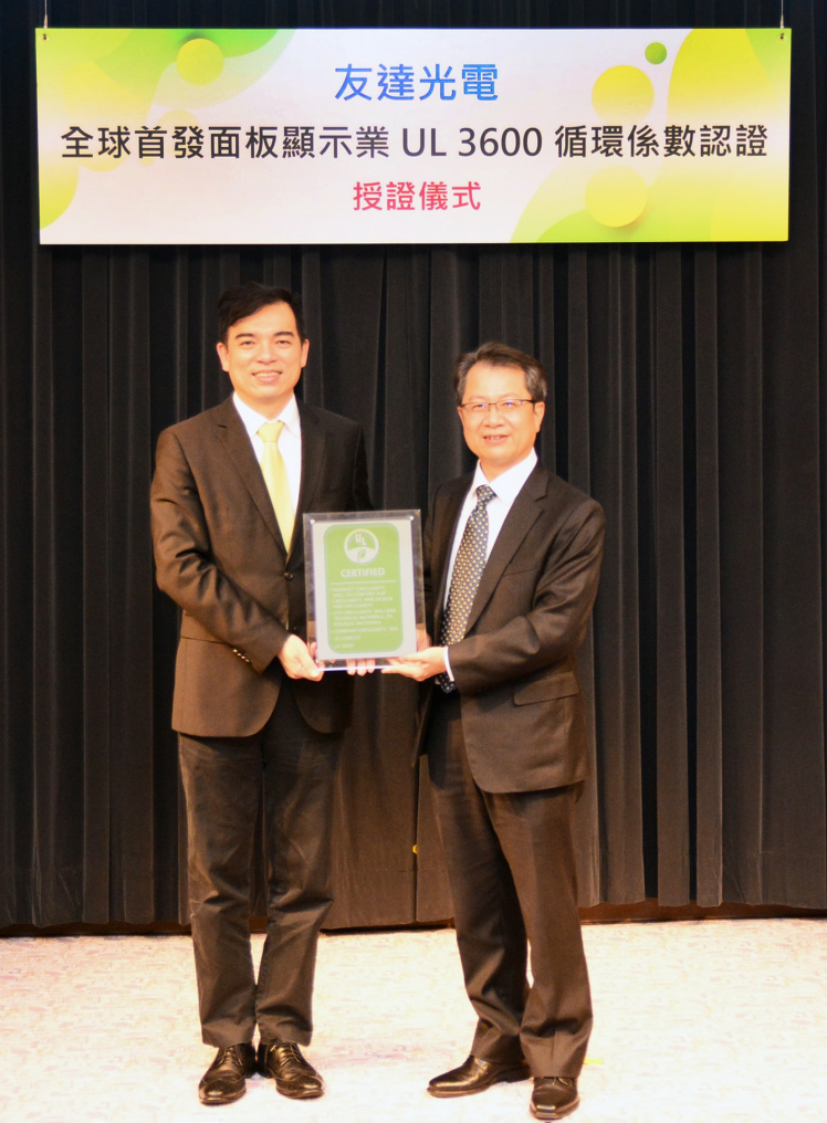 友達(dá)取得全球首張面板業(yè) UL 3600 循環(huán)係數(shù)認(rèn)證 ,由UL全球副總裁暨臺灣總經(jīng)理陳宗弘 (右) 、友達(dá)總經(jīng)理暨營運長柯富仁 (左) 進行授證儀式。 |
