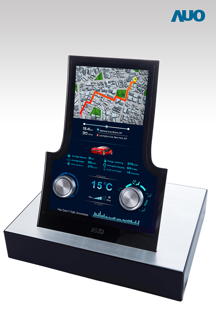 Free-form High Performance Car Displays with Superior Reliability & Design Flexibility In the past years, AUO has devoted tremendous effort in the development of high potency car displays to match modern smart cars. For CID applications, AUO will show the world’s first(*)13.2-inch free-form display featuring high resolution of 1200x1600, NTSC 85% high color saturation and 1000-nit brightness, with the gate circuit moved to the display active area to release extra space on the sides for free-form designs. Meanwhile, symmetrical holes are drilled in the active area to allow for more design flexibility, such as having buttons and control dials installed.