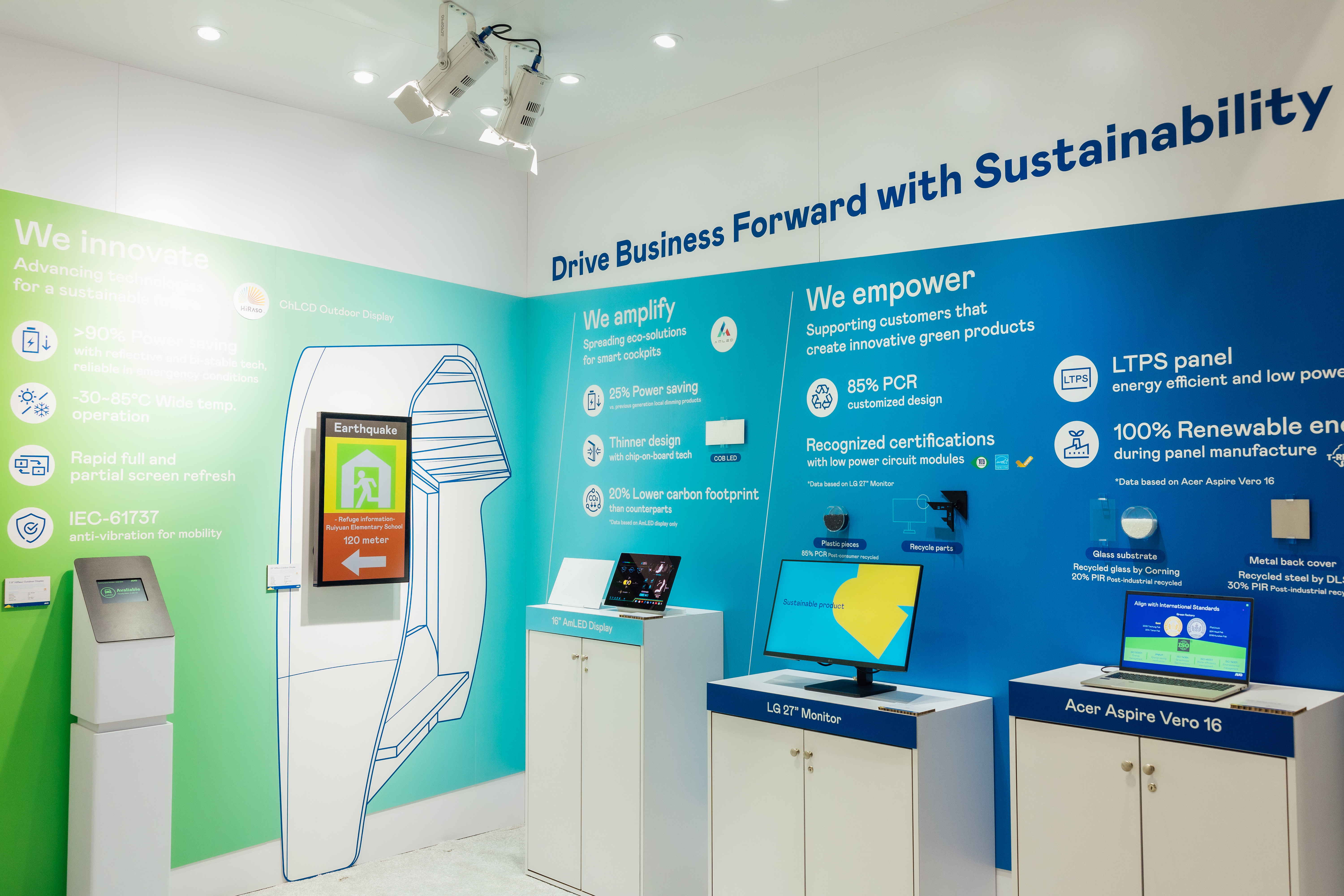 申博太陽城運(yùn)用創(chuàng)新顯示技術(shù)HiRaso膽固醇液晶雙穩(wěn)態(tài)技術(shù)達(dá)到顯示零耗能、擴(kuò)大節(jié)能省電的AmLED顯示技術(shù)應(yīng)用于車用產(chǎn)品 、以再生的消費(fèi)后回收(PCR)塑料及全綠電生產(chǎn)之面板 ,應(yīng)用于筆電及螢?zāi)?,增加綠色價值。