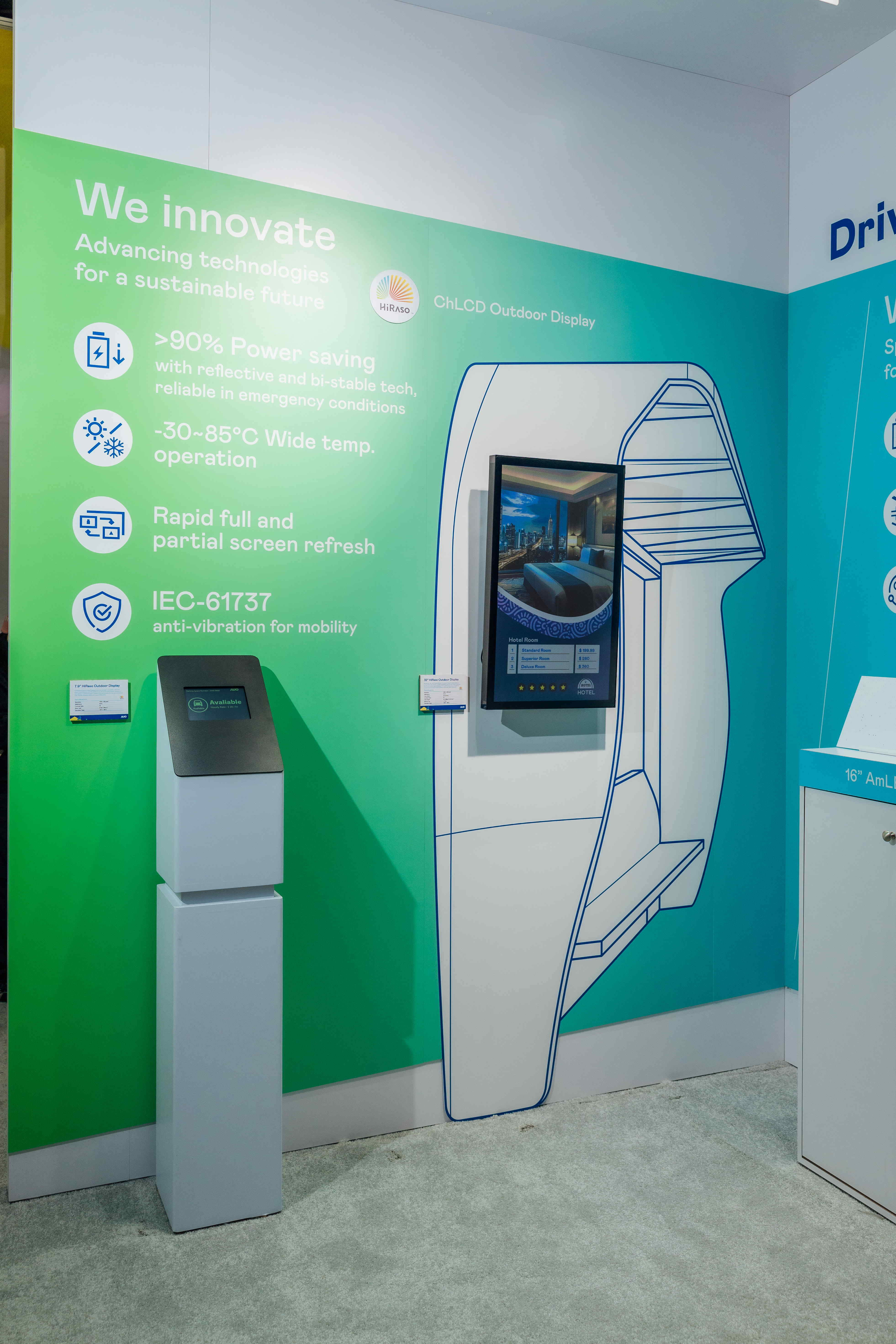 HiRaso膽固醇液晶顯示器運(yùn)用反射環(huán)境光線的方式,呈現(xiàn)影像顯示時零耗能的環(huán)保省電訴求 ,光線愈強(qiáng)愈能呈現(xiàn)絕佳的色彩飽和度及顯示效果,同時在攝氏-30度至85度間寬溫的使用優(yōu)勢,為戶外電子看板的新首選 。