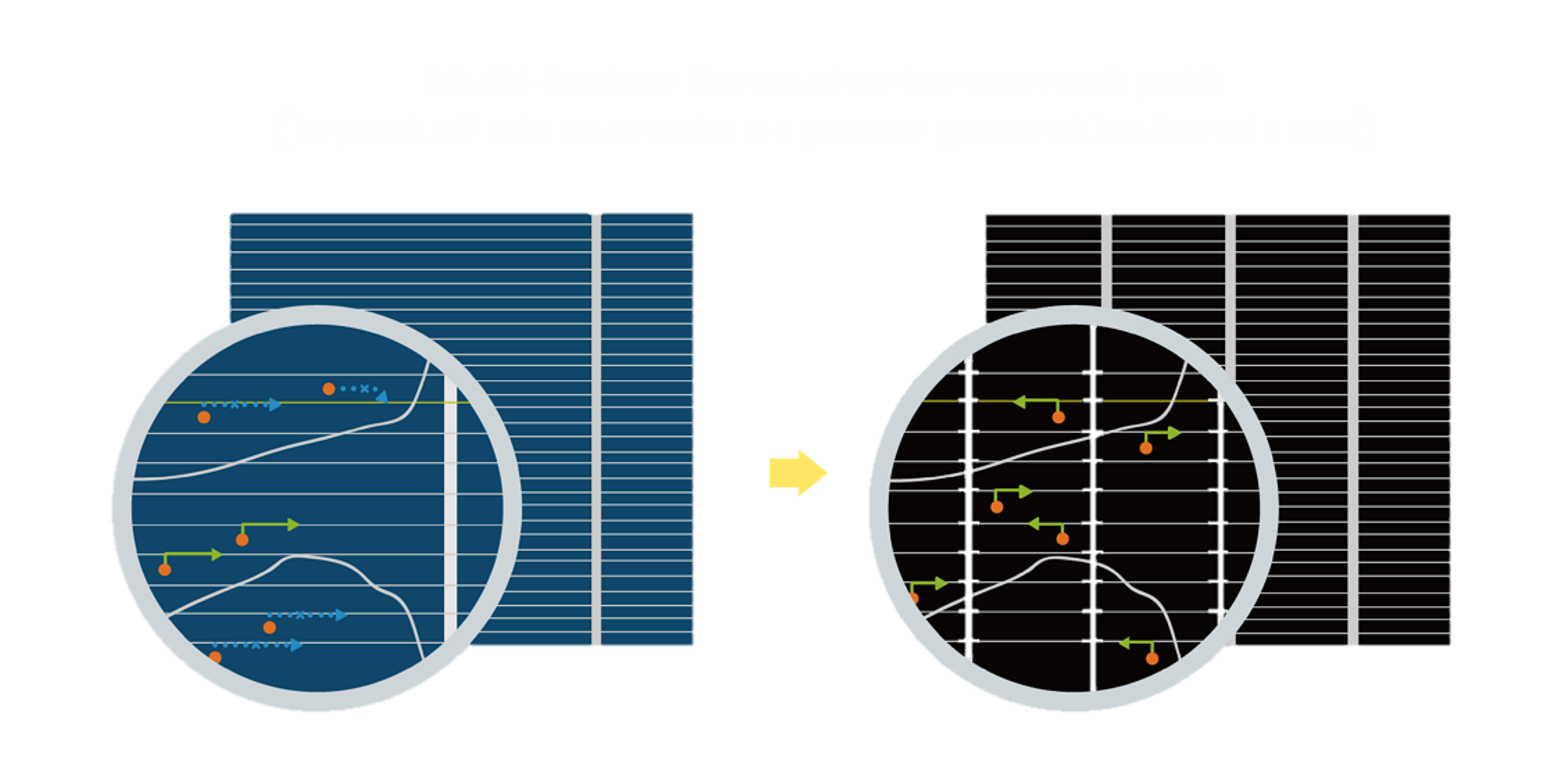 • 結(jié)合半切電池 ,降低遮陰影響、提升模組抗隱裂能力 、并減少電阻損耗,進(jìn)一步提升模組發(fā)電效能 。