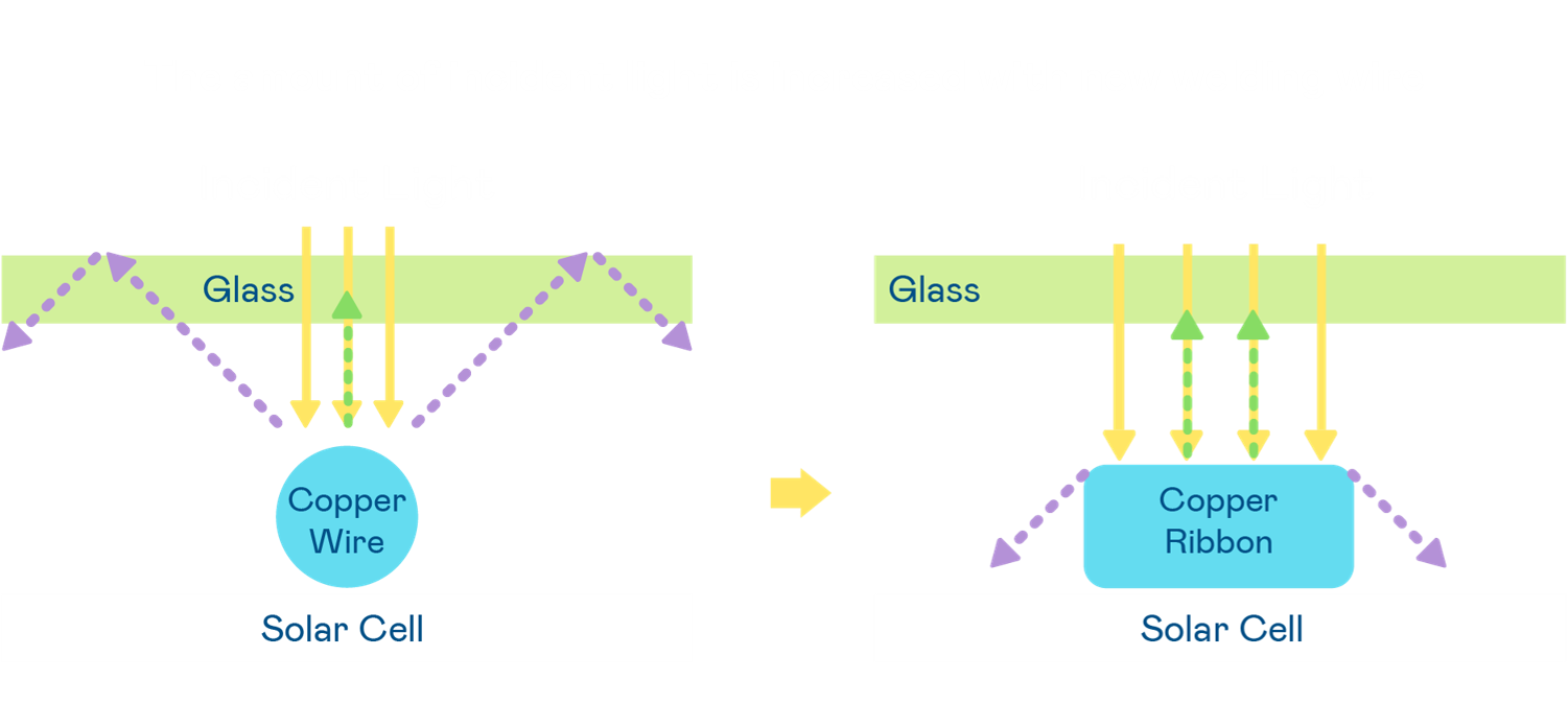 • 電池使用多條銅導(dǎo)線 (Copper wire) 于電池片上形成較短的電流路徑 ,提高電流收集效率,采用圓形設(shè)計(jì)的銅導(dǎo)線較傳統(tǒng)扁平式的銅焊帶 (Ribbon),可增加入射至電池的光線量。