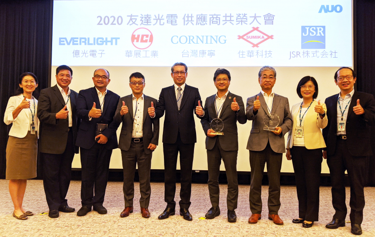 達肯定供應(yīng)商永續(xù)經(jīng)營的優(yōu)異表現(xiàn) ,頒發(fā)永續(xù)夥伴、環(huán)境友善及社會共融等獎項 。(左三:億光副總經(jīng)理李家豪 、左四 :華展執(zhí)行副總黃啟業(yè)、中 :臺灣康寧總經(jīng)理曾崇凱、右四 :住華總經(jīng)理暨營運長枝松邦茂 、右三 :JSR 董事長根本宏明) |