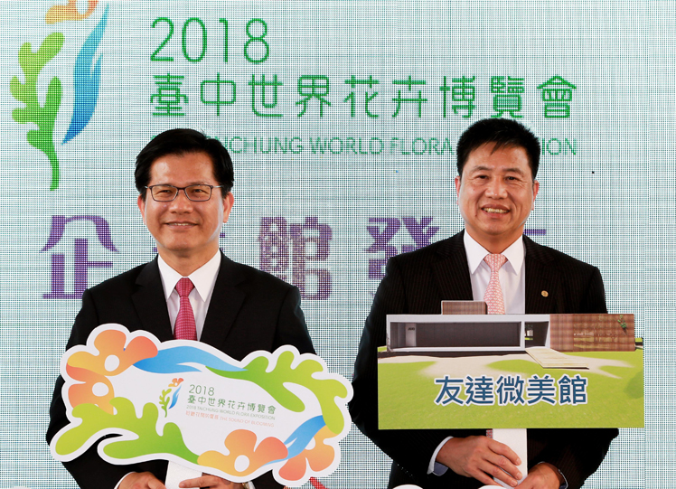 友達贊助 2018 臺中花博企業(yè)館,打造「友達微美館」(左:臺中市長林佳龍,右 :友達光電董事長暨執(zhí)行長彭雙浪) |